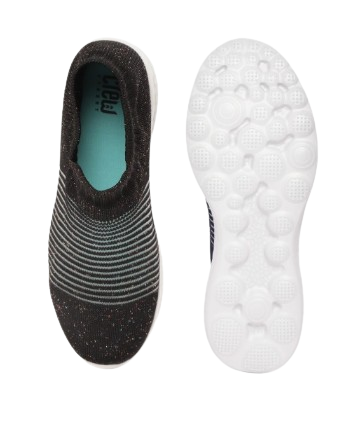 A pair of round-toe black striped slip-on sneakers with shimmer detail, has regular styling, slip-on detail
