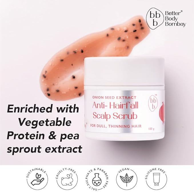 Revive dull, thinning hair from the roots with the bbb Better Body Bombay Onion Seed Extract Anti-Hairfall Scalp Scrub — a targeted pre-wash treatment designed to rejuvenate your scalp and reduce hair fall. This powerful 100g scrub: