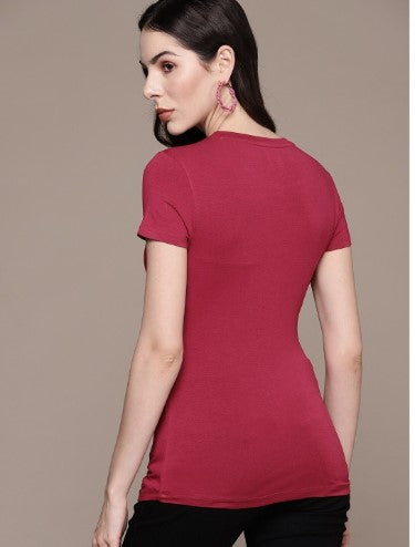 Featuring bold magenta colour & fitted style, this brand logo embellished top is an essential for your everyday wardrobe needs. Pair it with jeans or skirt, this top serves its purpose when it comes to versatility!